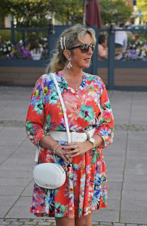 Mit Flower Power durch den Sommer. Mit einem Gürtel kannst Du auch ein weites Kleid Figurbetont tragen.