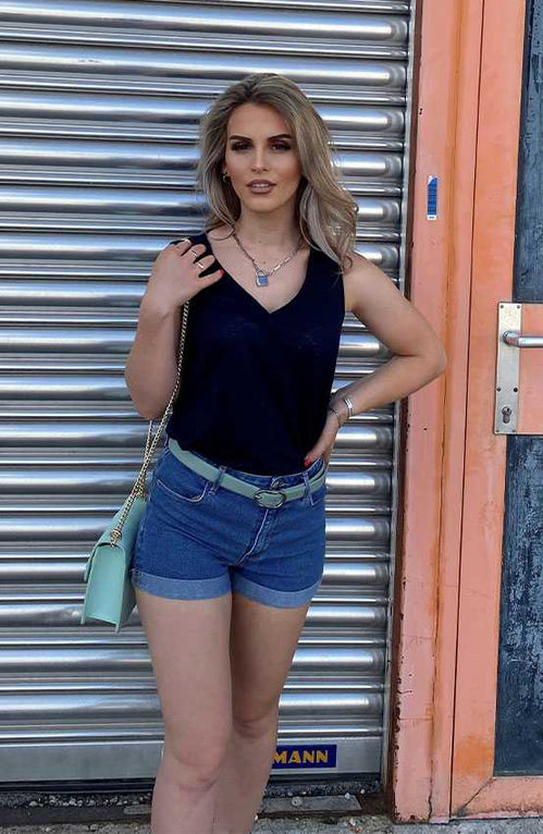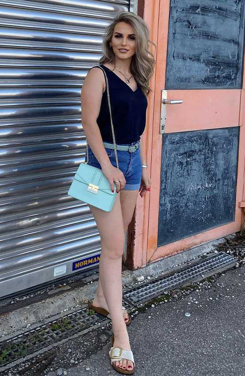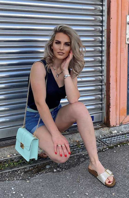 Jeans Shorts im Sommer sind einfach ein Must-Have und Birkenstock Sandalen gehen doch sowieso immer. Eyecatcher bilden die auffällige Tasche und der Gürtel – ein runder und moderner Look.