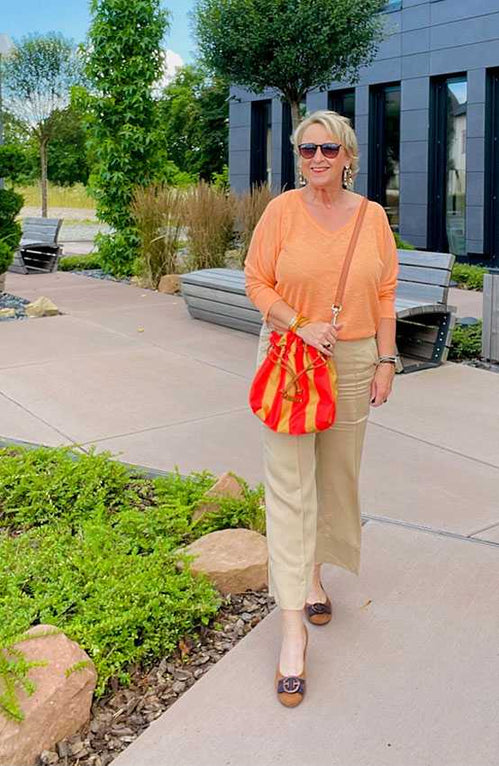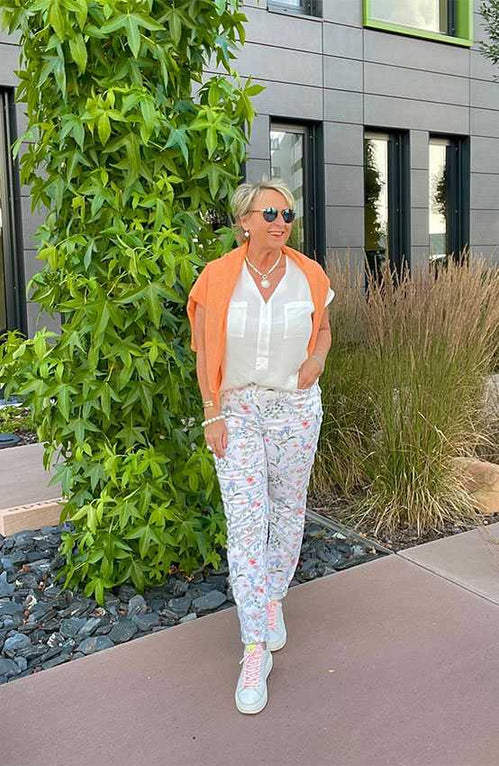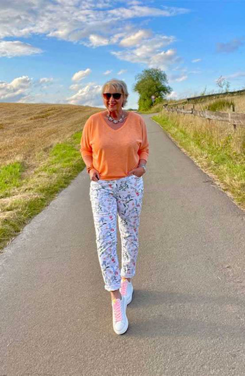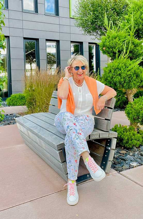 Geblümte Hose und auffallender Pullover – zu jeder Jahreszeit im Trend. Ob mit Stiefeln, Sneaker oder Sandalen