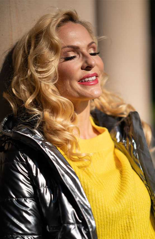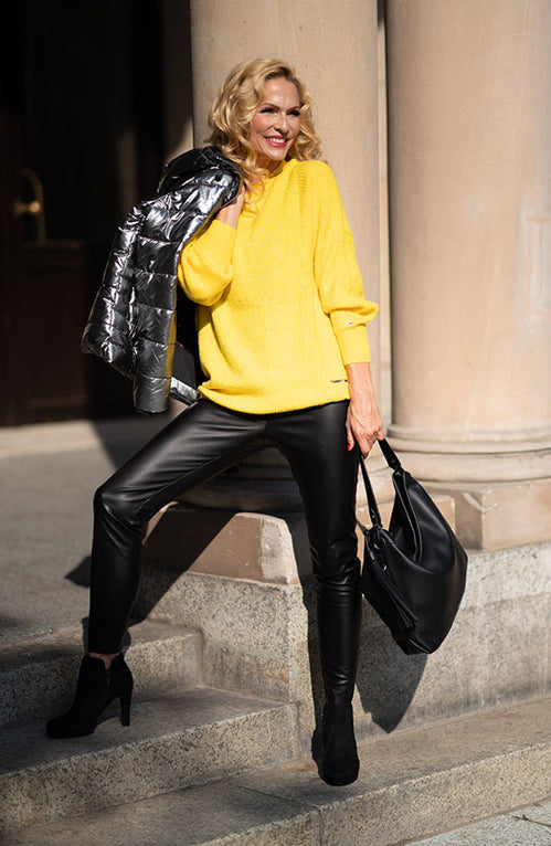 Knallige Farben in Kombination mit einer angesagten Lederleggings und schicken Stiefeletten.
