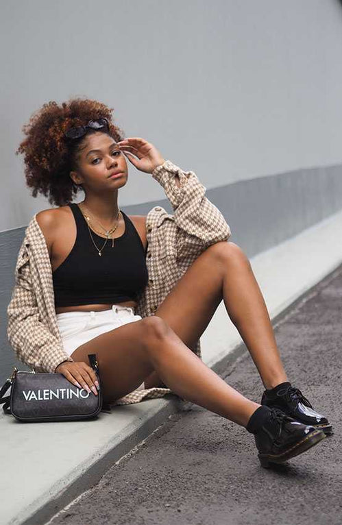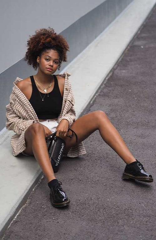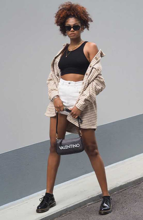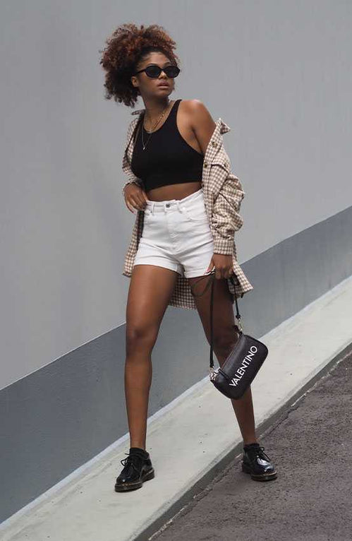 Nie mehr ohne – Shorts, lässige Bluse Dr. Martens und eine praktische Clutch und der Look steht.